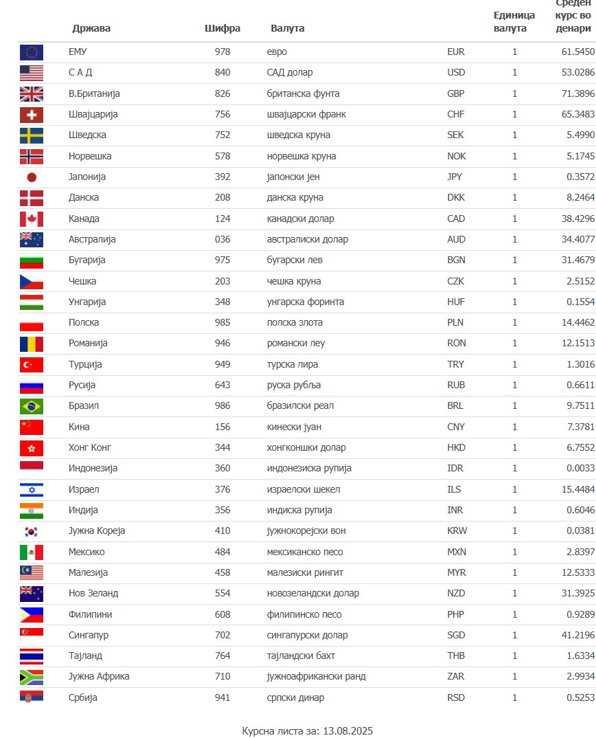 Курсна листа на Народната банка на Република Северна Македонија формирана на 12.08.2025 која се применува од 00:00 часот на 13.08.2025 година до почетокот на важење на новата Курсна листа: