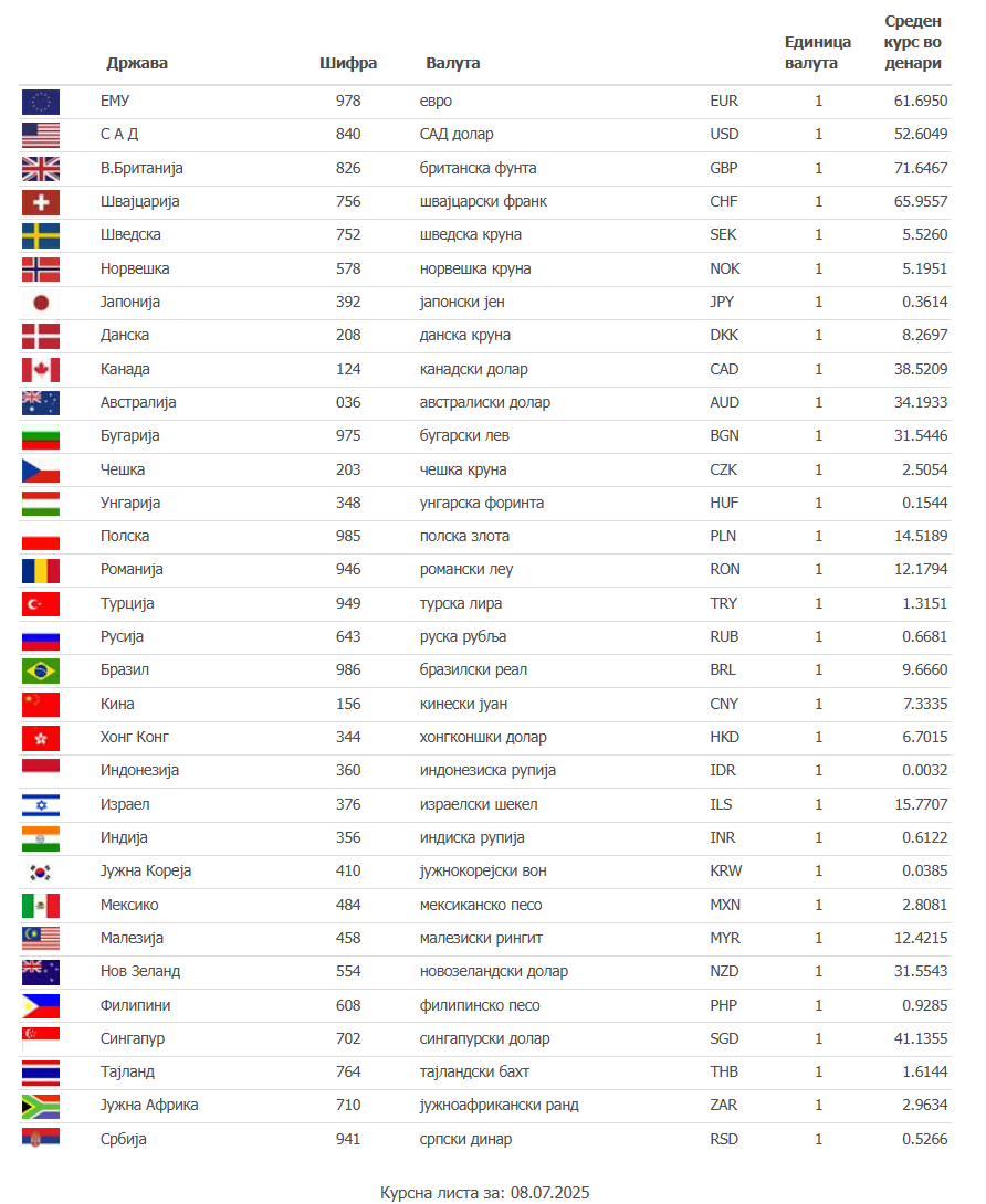 Курсна листа на Народната банка на Република Северна Македонија формирана на 07.07.2025 која се применува од 00:00 часот на 08.07.2025 година до почетокот на важење на новата Курсна листа