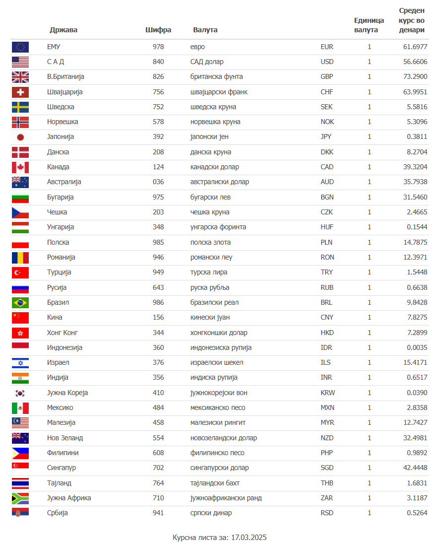 Курсна листа на Народната банка на Република Северна Македонија формирана на 14.03.2025 која се применува од 00:00 часот на 17.03.2025 година до почетокот на важење на новата Курсна листа: