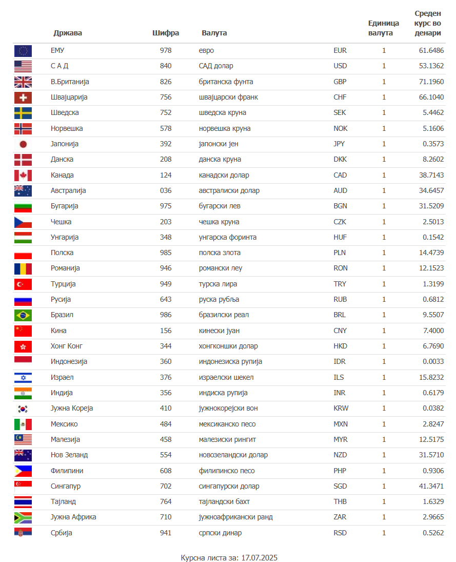 Курсна листа на Народната банка на Република Северна Македонија формирана на 16.07.2025 која се применува од 00:00 часот на 17.07.2025 година до почетокот на важење на новата Курсна листа: