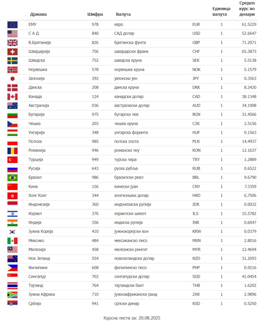 Курсна листа на Народната банка на Република Северна Македонија формирана на 19.08.2025 која се применува од 00:00 часот на 20.08.2025 година до почетокот на важење на новата Курсна листа