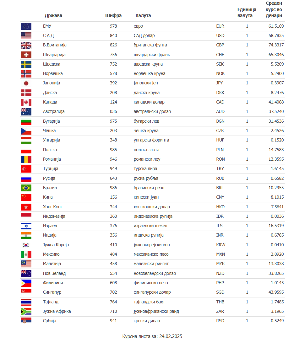 Курсна листа на Народната банка на Република Северна Македонија формирана на 21.02.2025 која се применува од 00:00 часот на 24.02.2025 година до почетокот на важење на новата Курсна листа: