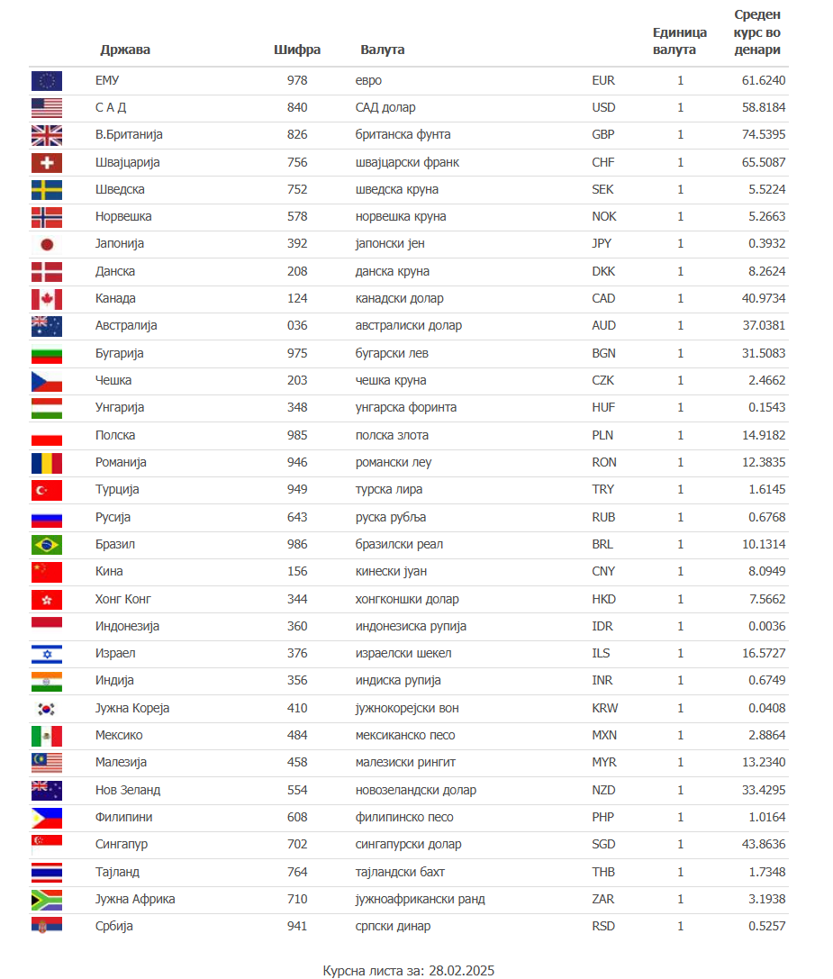 Курсна листа на Народната банка на Република Северна Македонија формирана на 27.02.2025 која се применува од 00:00 часот на 28.02.2025 година до почетокот на важење на новата Курсна листа: