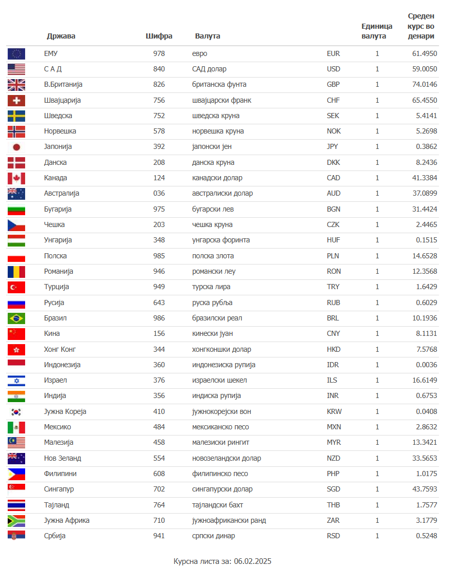 Курсна листа на Народната банка на Република Северна Македонија формирана на 05.02.2025 која се применува од 00:00 часот на 06.02.2025 година до почетокот на важење на новата Курсна листа: