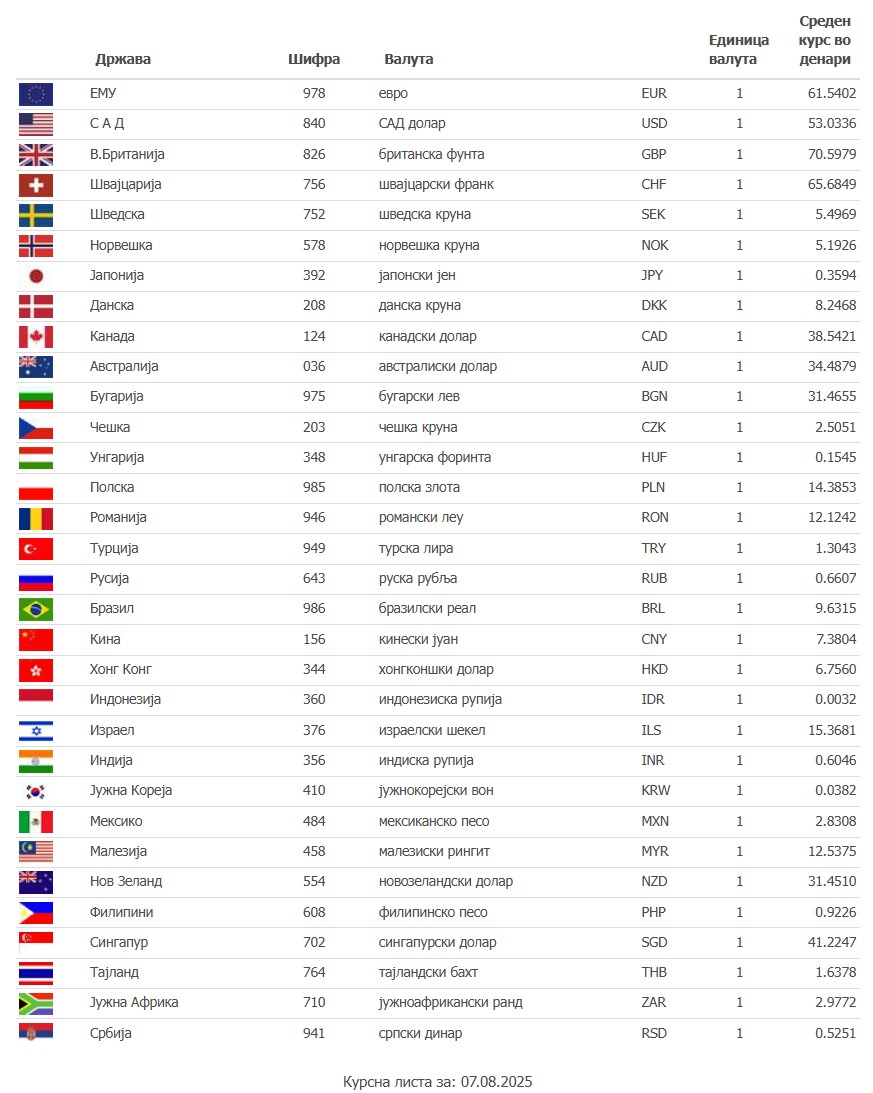 Курсна листа на Народната банка на Република Северна Македонија формирана на 06.08.2025 која се применува од 00:00 часот на 07.08.2025 година до почетокот на важење на новата Курсна листа: