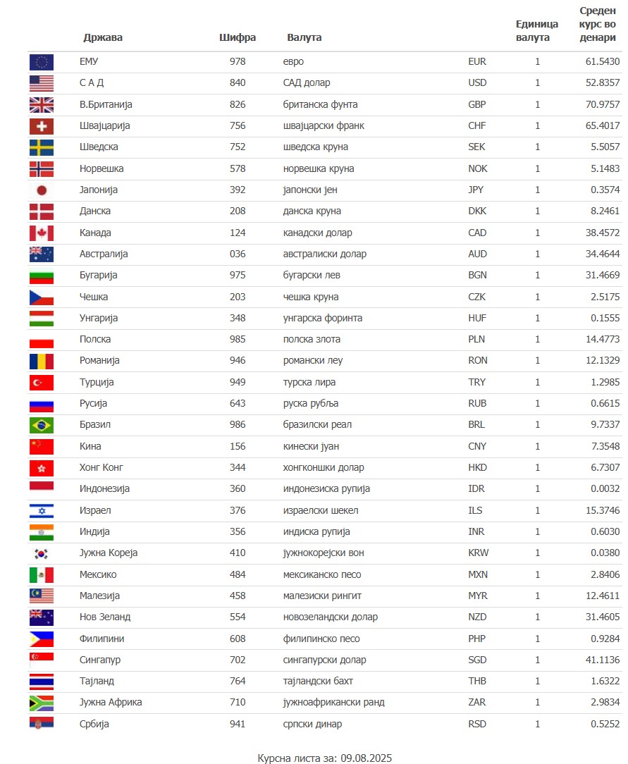Курсна листа на Народната банка на Република Северна Македонија формирана на 08.08.2025 која се применува од 00:00 часот на 09.08.2025 година до почетокот на важење на новата Курсна листа