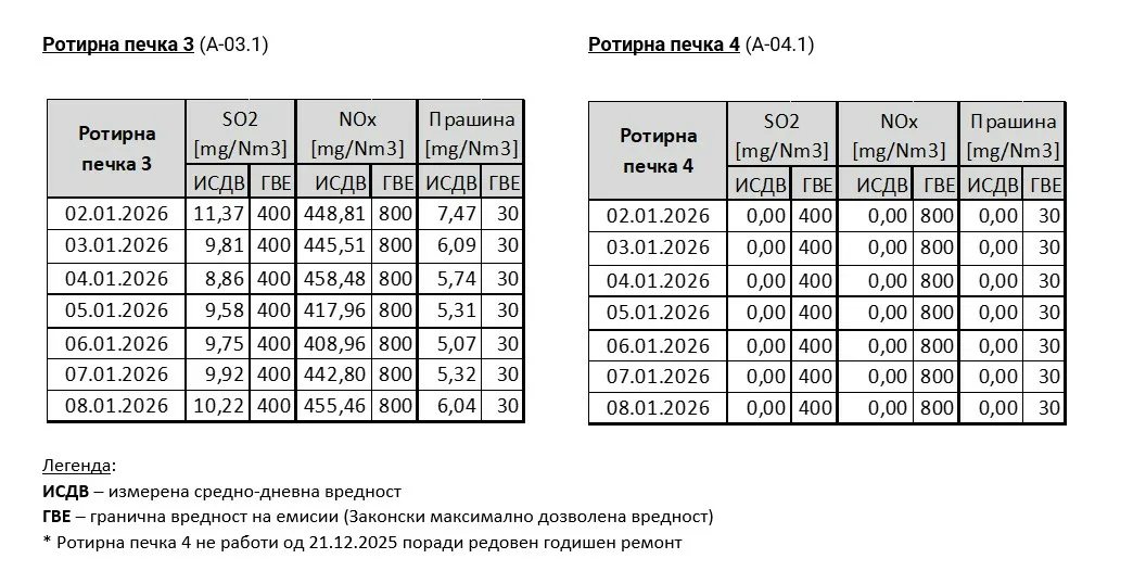 Неделен извештај за измерени средно-дневни вредности на емисии од главните емисиони точки во ТИТАН УСЈЕ (02.01.2026 – 08.01.2026)