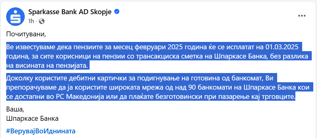Ве известуваме дека пензиите за месец февруари 2025 година ќе се исплатат на 01.03.2025 година, за сите корисници на пензии со трансакциска сметка на Шпаркасе Банка, без разлика на висината на пензијата.
